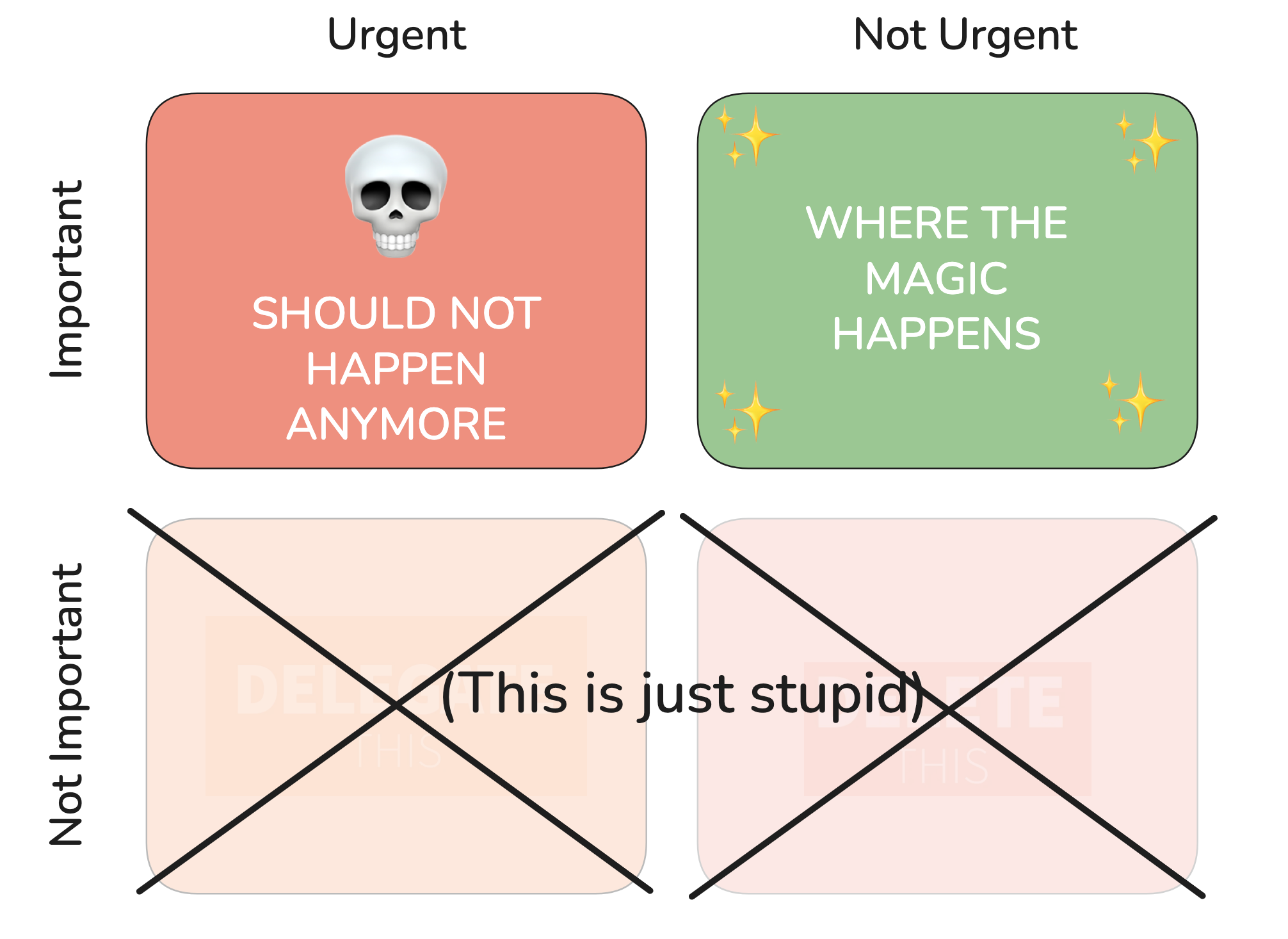 I use this Eisenhower matrix in the following way: any items that are “important and urgent” are an alarm to work on something long term (“Important, Not Urgent”). They must be resolved immediately, after all, they’re both “important AND urgent’. But this shouldn’t be taken lightly. It should be dealt with NOW, but prevented in the future.
